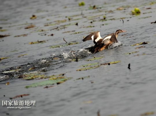 8月3日,一只野鴨在那木斯萊湖水面上準(zhǔn)備起飛。