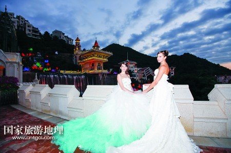 乘著電瓶車(chē),從客天下廣場(chǎng)穿過(guò)雅致的圣山湖住宅區(qū),赫然出現(xiàn)在眼前的卻是大型婚禮殿堂,純歐式的建筑群隱匿在青山綠水中:乳白色的圓形屋頂、七彩斑斕的玻璃窗、富麗堂皇的大吊燈,見(jiàn)證了一對(duì)又一對(duì)新人走進(jìn)幸福的殿堂。在充滿(mǎn)異域風(fēng)情的幸福里大街,蘇格蘭風(fēng)笛表演、皇家馬車(chē)、中世紀(jì)格調(diào)的咖啡館,一幕又一幕,讓人恍若時(shí)空交錯(cuò)。
