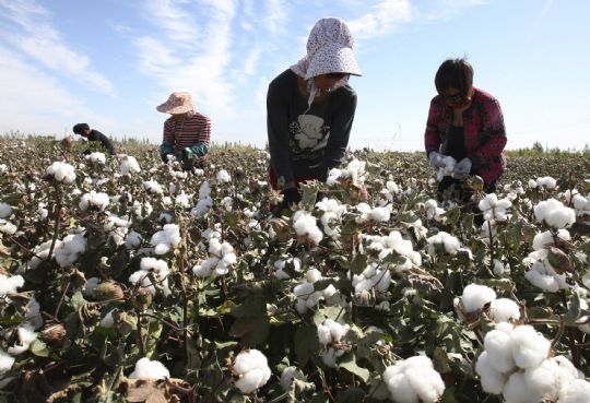 9月24日,幾名拾花工在新疆哈密現(xiàn)代農(nóng)業(yè)園區(qū)棉區(qū)采摘棉花。
