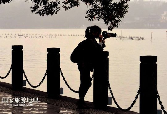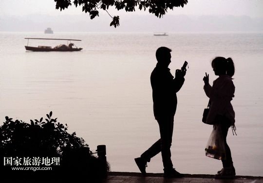 國家旅游地理 浙江杭州11月5日訊 11月4日,一對男女青年在西湖邊拍照留影。生活在杭州的人是幸福的,因為杭州有西湖。清晨的西湖,恬靜,淡雅,柔美,朦朧。岸邊,堤上,健身鍛煉的市民、散步賞景的游人,在湖水、小橋、亭閣、石欄的襯伴下,構成了一幅幅剪影效果的水墨圖畫。 /新華社記者王頌攝