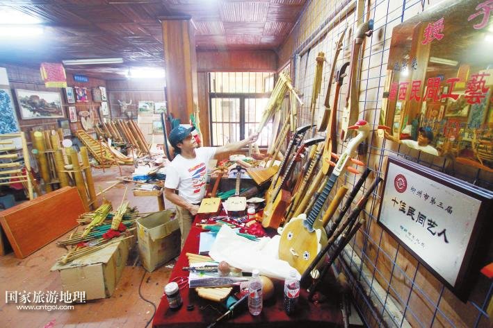 國家旅游地理 廣西柳州11月11日訊(記者陸旺楊春) 牽手漫步龍?zhí)睹琅希⒓缈勘炽逶⊥砬锱?,你?huì)時(shí)常聽到一串串動(dòng)人的音符:它時(shí)而渾厚圓潤、清脆響亮,時(shí)而輕靈縹緲、悠長凄美。不忍打破這份寂靜閑情,卻又忍不住猜想:這是何方人士,用何種樂器,吹拉彈撥出如此佳音?穿越叢林,循聲走去,瑤寨庭前,幾個(gè)年輕男女手握蘆笙,身子左搖右晃,吹得正起興。步入瑤寨一樓才發(fā)現(xiàn),這里儼然一個(gè)生產(chǎn)民族樂器的大工廠:木板、竹竿、鐵鋸、膠水、油漆,以及形狀酷似牛頭、牛腿、魚身、龍身等顏色各異、五花八門的樂器……一位正在給樂器上漆的中年人梁志榮告訴記者,這是龍?zhí)豆珗@正在籌建的民族樂器館,也是魚峰區(qū)創(chuàng)建廣西文化強(qiáng)區(qū)的特色景區(qū)之一,他現(xiàn)在是大龍?zhí)睹褡逅囆g(shù)團(tuán)團(tuán)長,研究、制作民族樂器將近20年,曾獲“廣西民間工藝大師”和“十佳民間藝人”稱號(hào)。