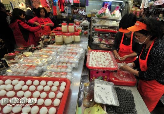 12月22日,臺(tái)北市南門(mén)市場(chǎng)的攤主手工包湯圓,供顧客選購(gòu)。