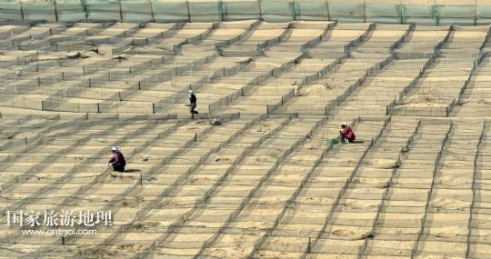 國(guó)家旅游地理 內(nèi)蒙古阿拉善4月21日訊 錯(cuò)落布局在內(nèi)蒙古臨策鐵路(臨河——策克)旁的網(wǎng)格沙障(4月18日攝)。穿越我國(guó)北疆內(nèi)蒙古阿拉善高原大漠的呼和浩特鐵路局臨策鐵路沿線有400多公里“無(wú)人區(qū)”,這里常年干旱少雨、風(fēng)沙肆虐、植被稀少、人跡罕至,30多萬(wàn)平方公里的荒漠、戈壁縱橫交錯(cuò),自然條件極度惡劣。