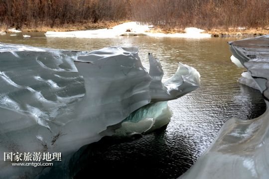 內(nèi)蒙古阿爾山市白狼林區(qū)陸續(xù)消融的河谷冰雪(5月14日攝)。