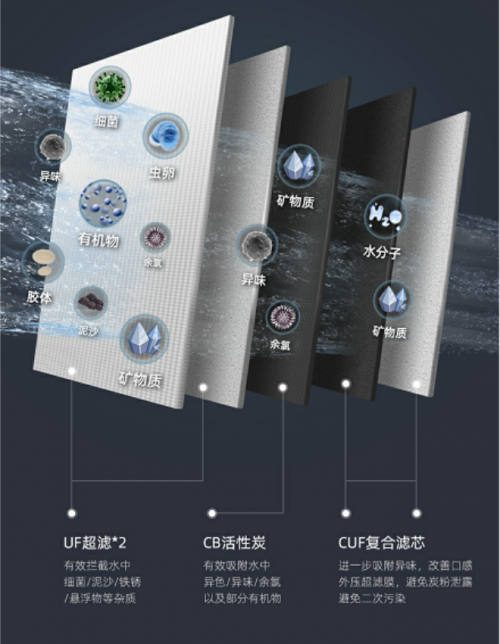 除去主濾芯,另外兩個副濾芯分別是CB活性炭濾芯和CUF活性炭超濾膜復合濾芯。其中,CB活性炭濾芯吸附水中余氯、異色異味、有機物,改善飲水口感,讓自來水變得更加甘甜鮮活,口感甚佳;而CUF活性炭超濾膜復合濾芯則能進一步吸附水中的余氯等異色異味,提升飲水口感,并防止碳粉泄露和微生物侵入,避免水質(zhì)二次污染。